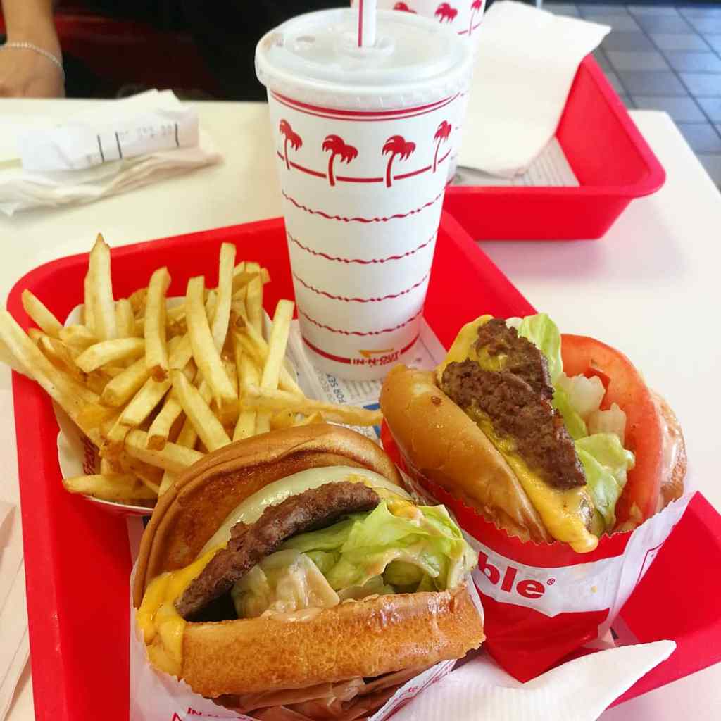 Walk of Famelta kävelimme In’nOutiin. Oli juuri niin hyvää kuin olen aina ajatellut. Tai ranskalaiset olivat huonot, mutta burgeri täydellinen. Paikan päällä oli todella paljon jonoa, mutta jono kulki nopeasti ja vapaita pöytäpaikkoja tyhjeni koko ajan.