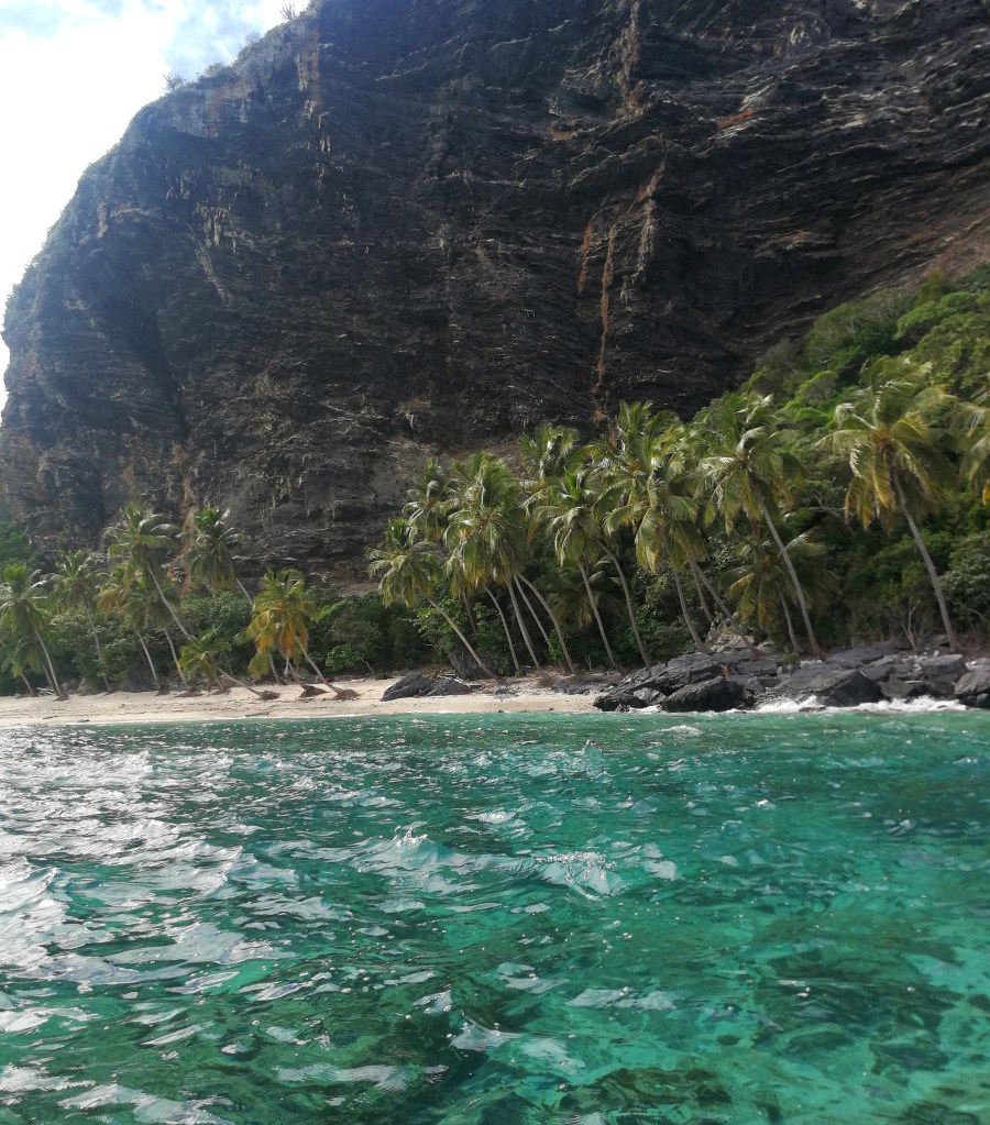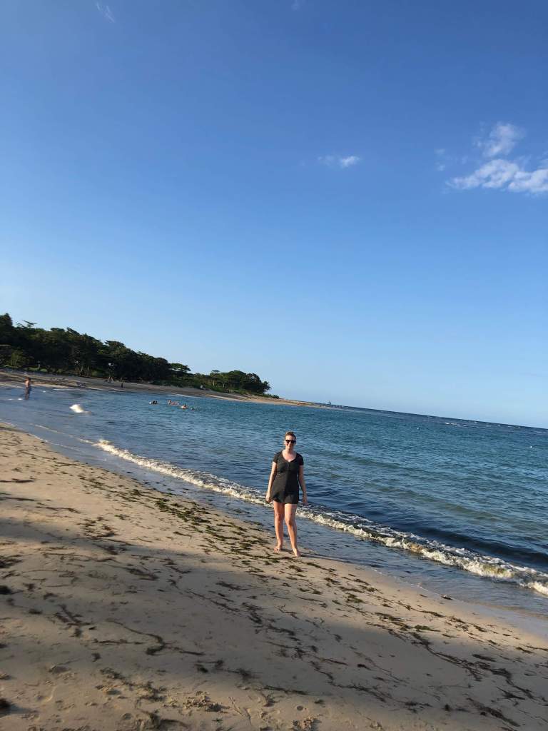 Näin kirkasta merivettä en ole nähnyt missään. Upea ranta, jolla ei ollut ketään muita. No ilmankos, kun varmasti kaikki muut tajusivat, ettei tämä ole ranta, jolle tullaan myrskysäällä. Rantaan päästyä tärisin, varmaan itkin ja olin vain paniikissa. Yritin soittaa äidilleni, mutta alue oli puhelinverkkojen saavuttamattomissa. Ja sitten iski rankkasade. Osa juoksi sadetta suojaan luolaan, mutta itse jäin paniikista kankeana seisomaan jonkun puun alle. Miten me päästäisiin ikinä täältä pois? Kuulema rannalta pystyisi myös kävelemään, mutta matka olisi vaikeakulkuista viidakkoa monta tuntia. Sinne me vähintäänkin kuoltaisiin. Sateen loputtua paniikki alkoi laskea ja päästiin nauttimaan tästä palmuparatiisista.