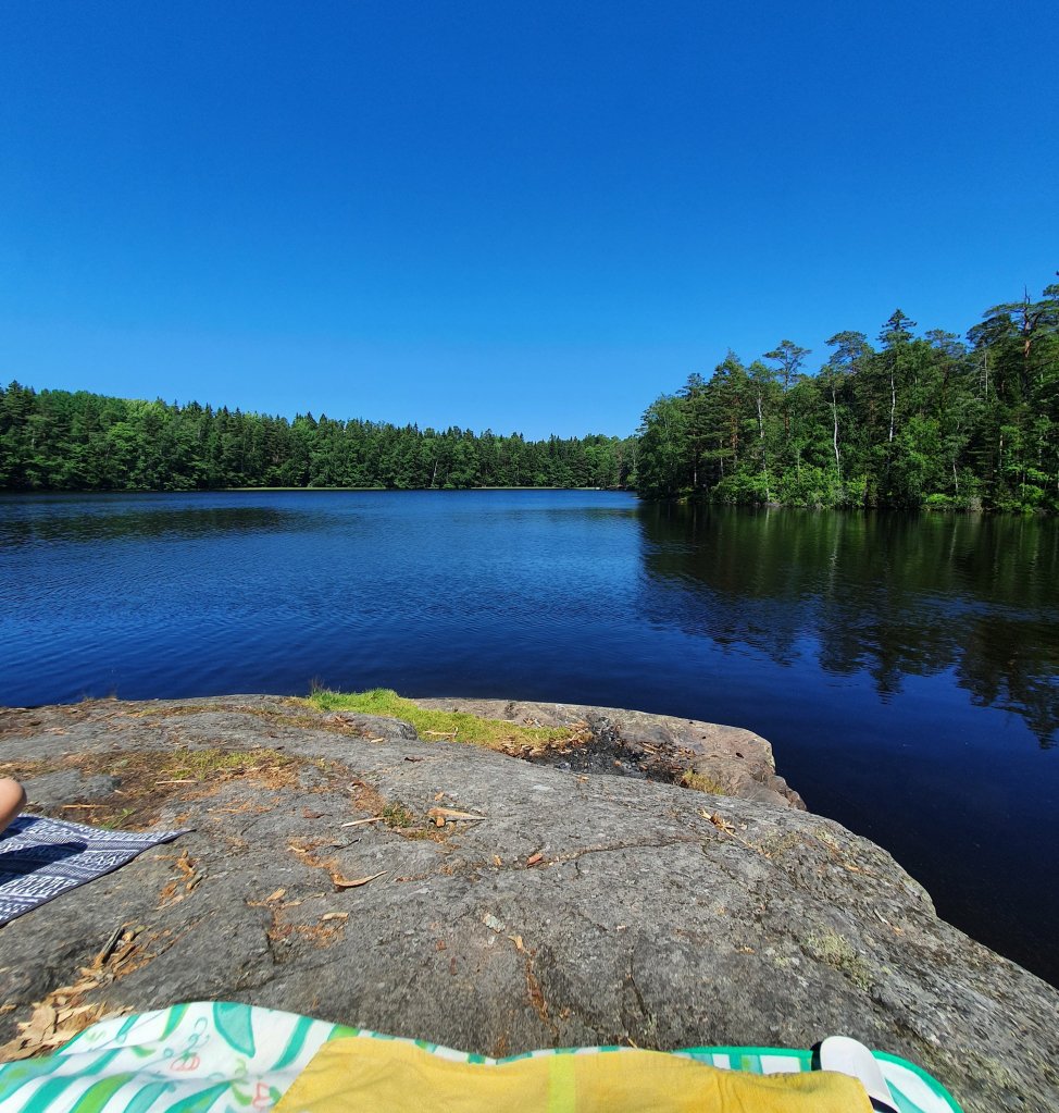 Järven rannalla ei ollut varsinaista hiekkarantaa, mutta useita kallioita, joille pystyi jäämään nauttimaan auringosta. Liukkaalta kalliolta veteen pääseminen ei ollut mikään helpoin tehtävä, mutta niin sen pienen vaivan arvoista. Useimmiten uin joko meressä tai joessa, joten olipa järvessä uiminen ihanaa! Tämä oli paras uintikokemus pitkään aikaan, sillä vesi oli todella lämmintä ja uiminen oli niin paljon miellyttävämpää, kun ei ollut virtauksia. Tai muita uimareita.